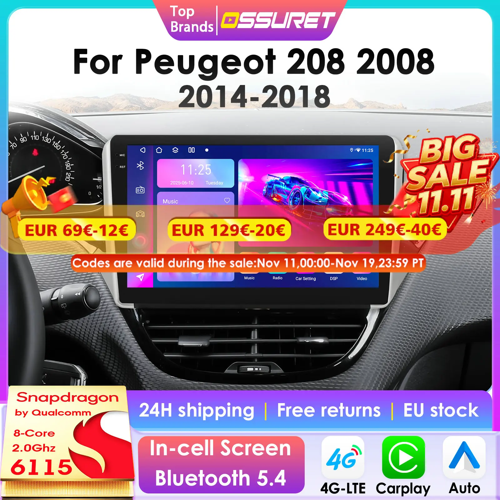 10.1 "Qualcomm 6115 Android 14 autoradio pour Peugeot 208 2008 2014 - 2018 sans fil CarPlay And...