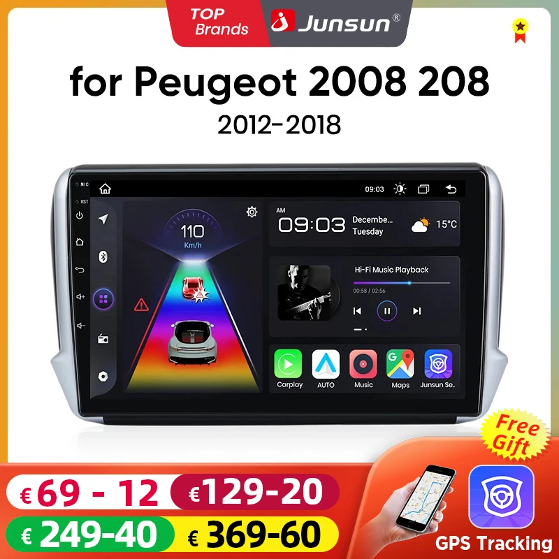 Junsun Android sans fil CarPlay Auto autoradio pour Peugeot 2008 208 2012-2018 systèmes intel...