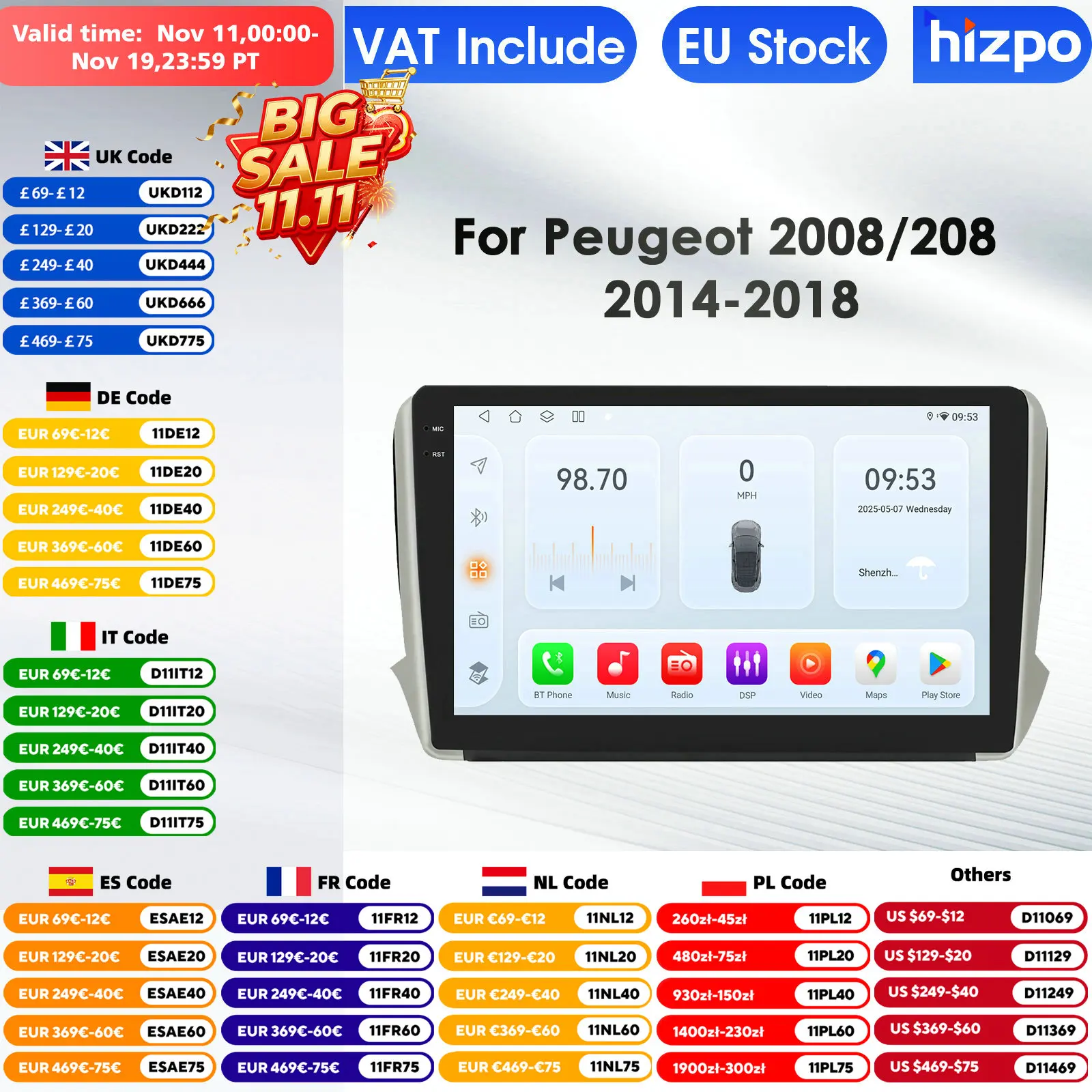 Hizpo autoradio pour Peugeot 2008 208 2014 - 2018 sans fil CarPlay ...