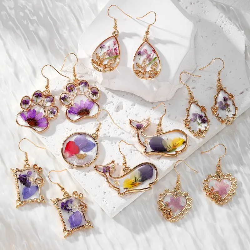 Boucles d'oreilles élégantes à fleurs réelles pour femmes, résine...