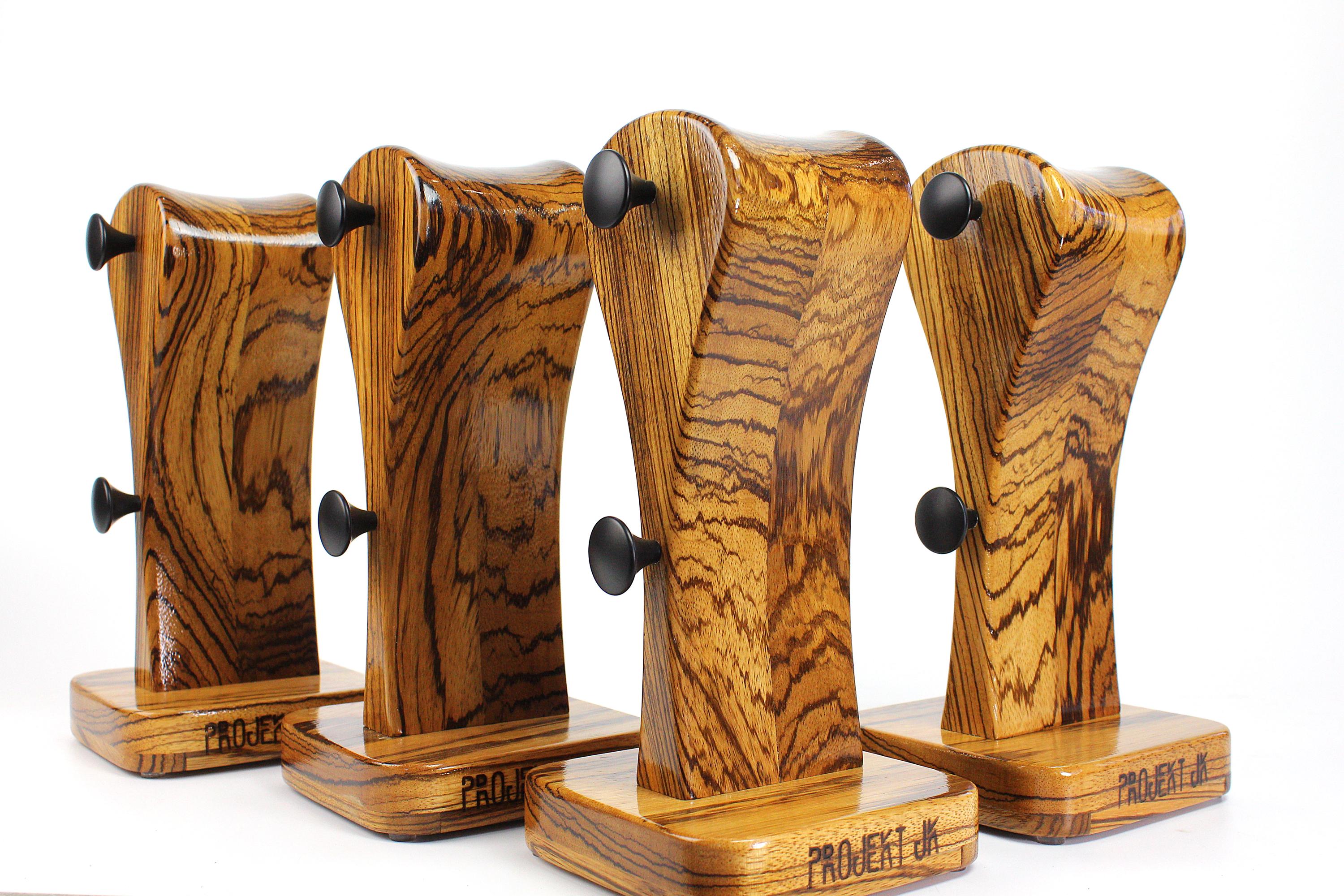 Support pour casque en bois de zebrano africain fait à la main. C'est un bois unique et magni...