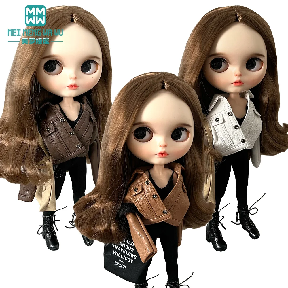 Blyth Doll Clothes azon OB22 OB24 Veste en simili cuir à la mode marron, blanc, noir