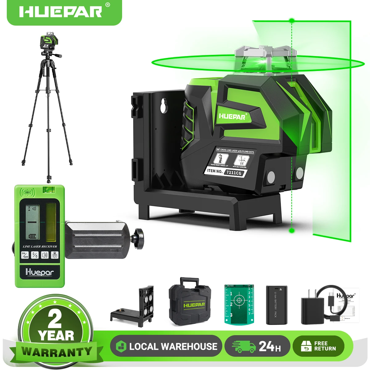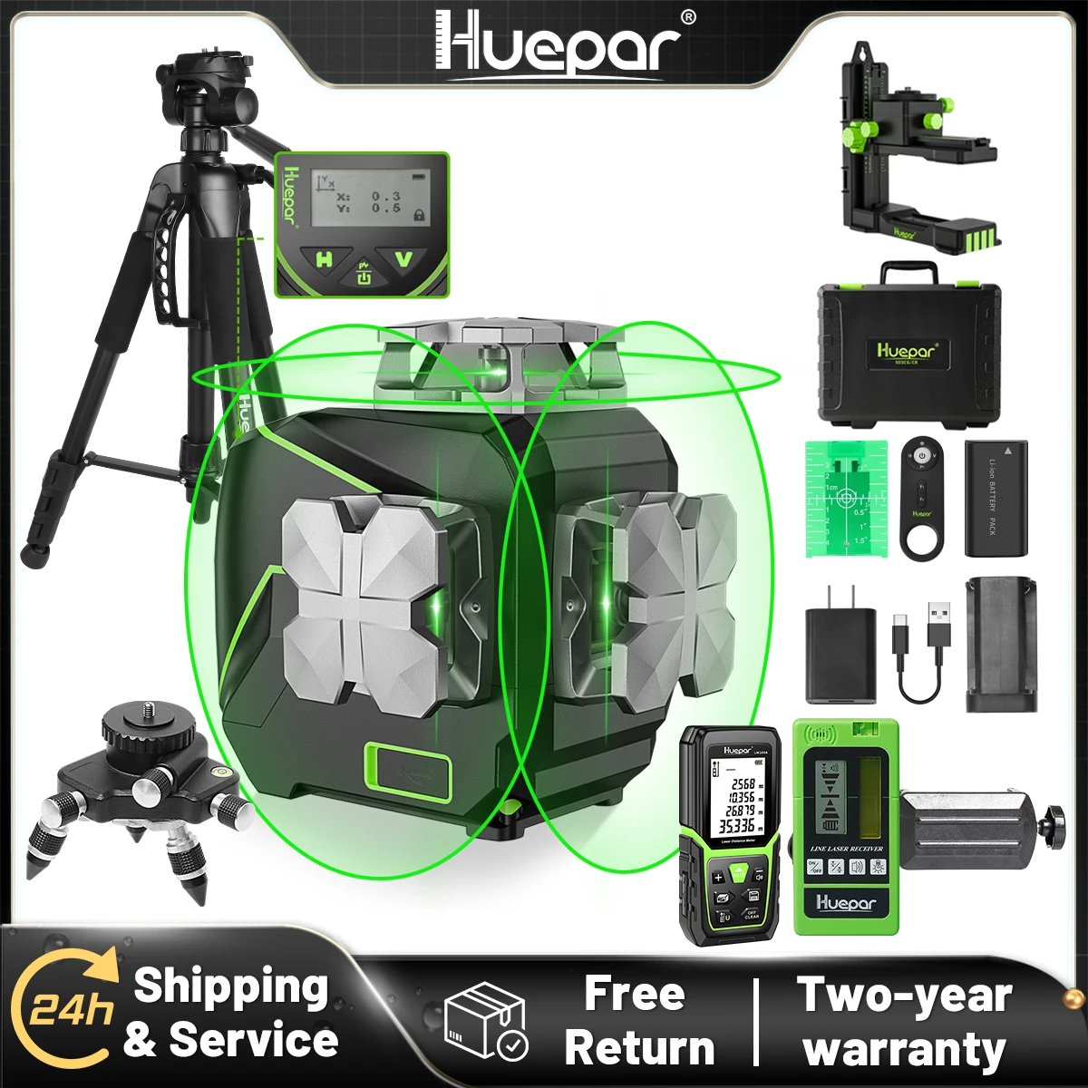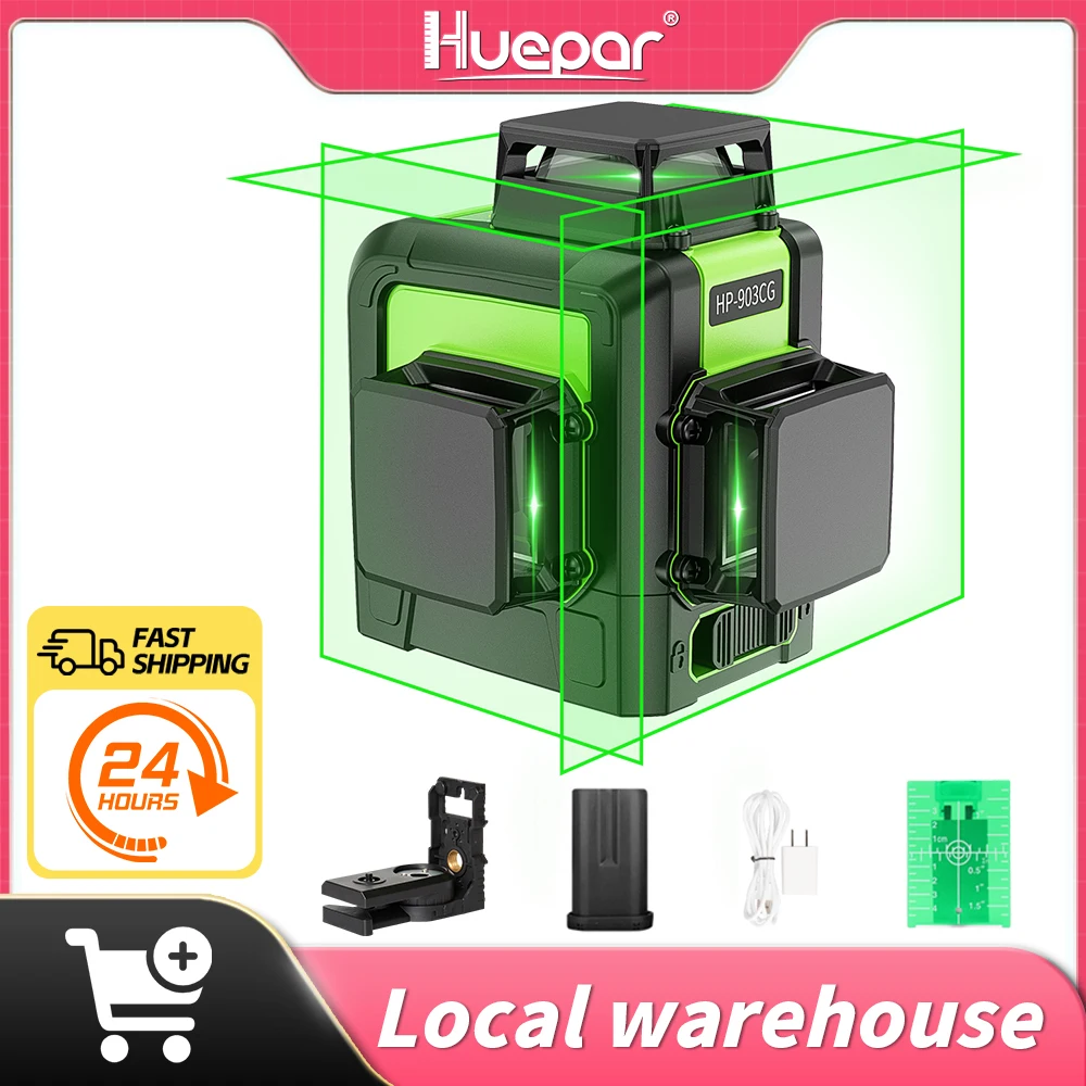 Huepar-Niveau laser professionnel 903CG, ligne croisée 3D, faisceau laser vert Osram, 12 lign...