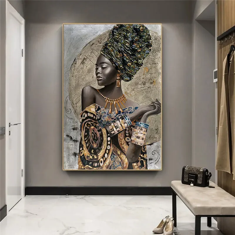Affiche africaine de mode de luxe, imprimés sur toile de femme dorée et noire, peintur...