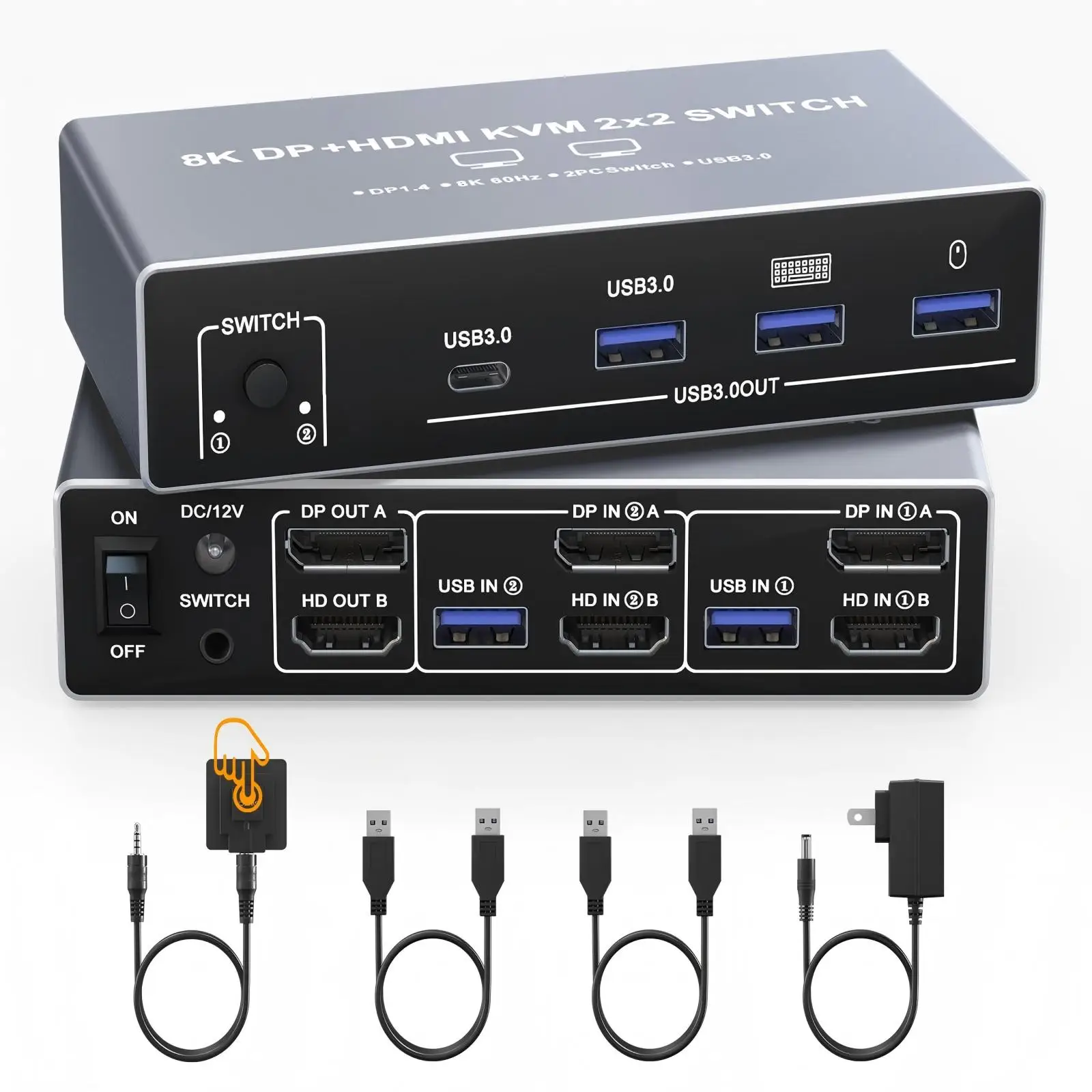 Commutateur KVM double moniteur 8K, Commutateur KVM DisplayPort HDMI 2 moniteurs 2 ordinateurs, Comm...