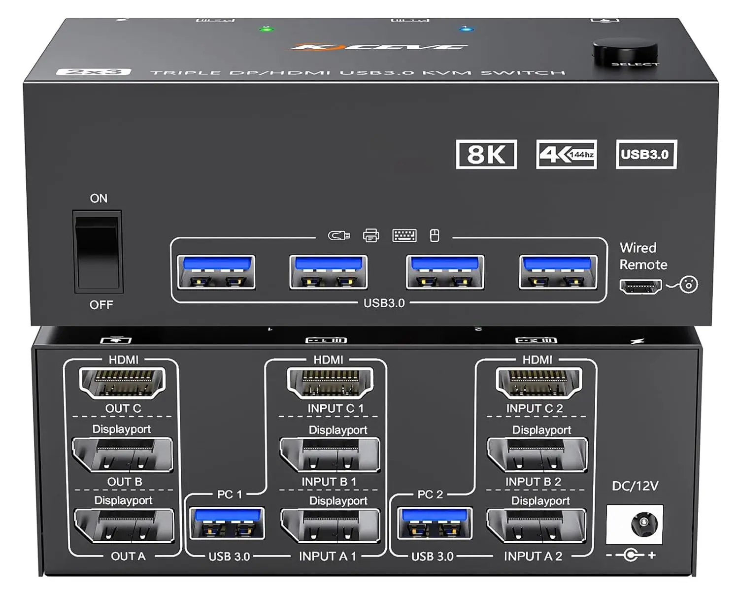 Commutateur KVM Displayport 8K @ 60Hz, 3 moniteurs, 2 ordinateurs, ...