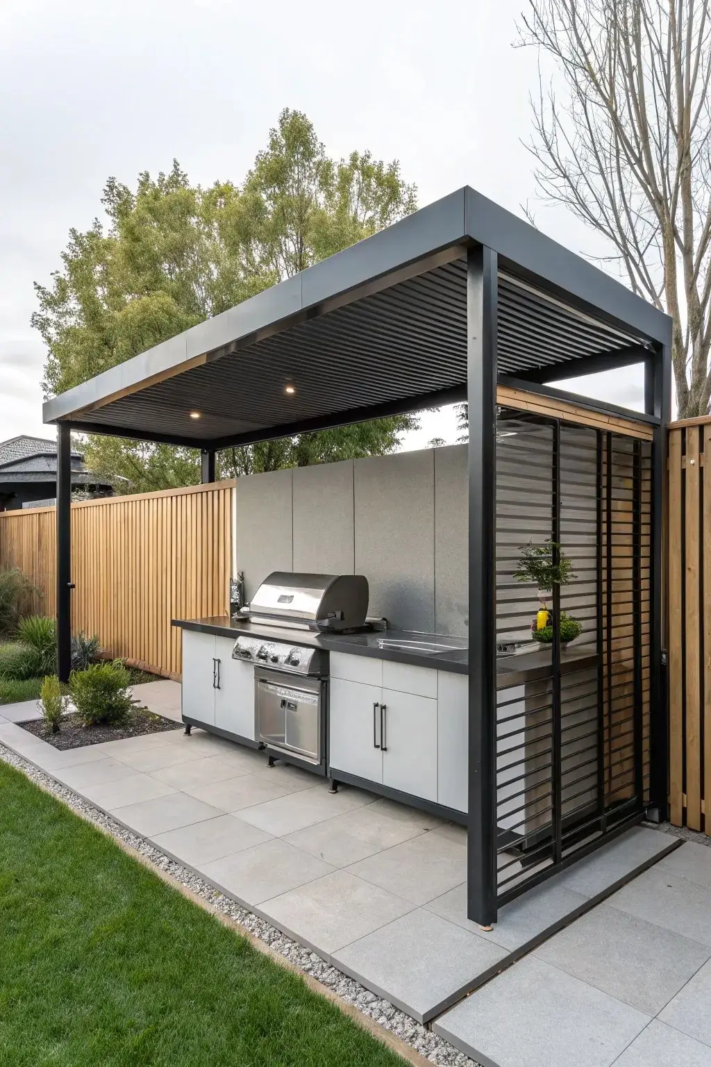 Pergola bioclimatique moderne à persiennes, tube carré...