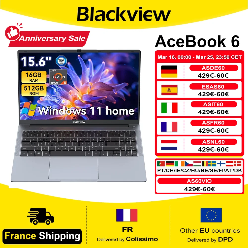 Ordinateur portable Blackview AceBook 6, AMD Ryzen 5 3500U, écran LCD IPS 15,6 pouces FHD 16:...