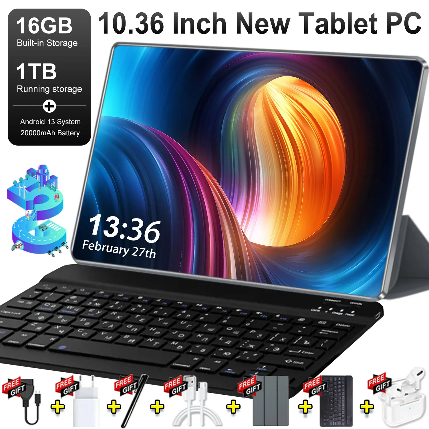 Nouvelle tablette Android 13 HD de 10,36 pouces, 5G, double SIM, 16 Go de RAM, 1 To de ROM, 10 c&oel...