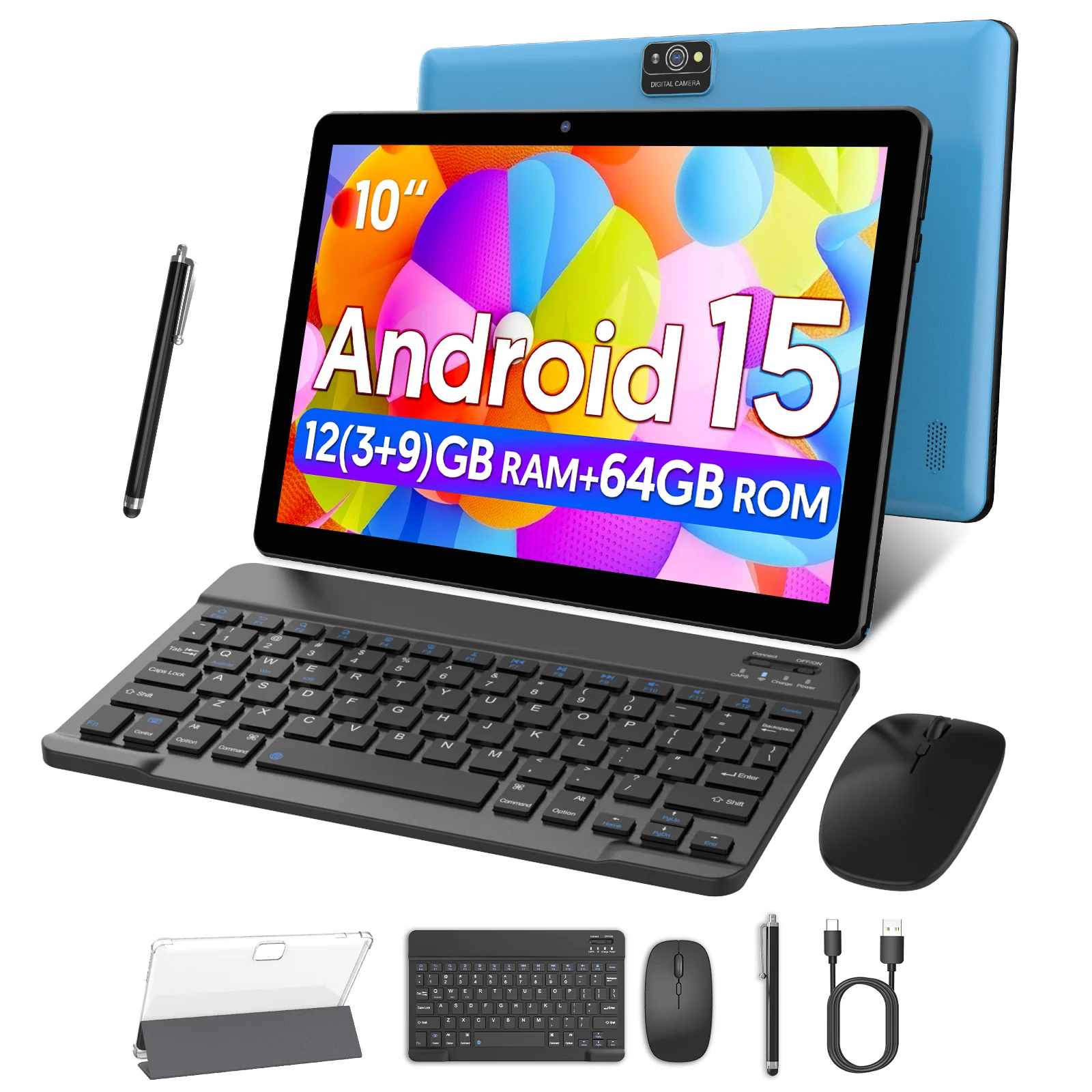 Tablette Android 15, écran 10,0 pouces, processeur quad-core, 12 Go de RAM (3 Go + 9 Go), sto...
