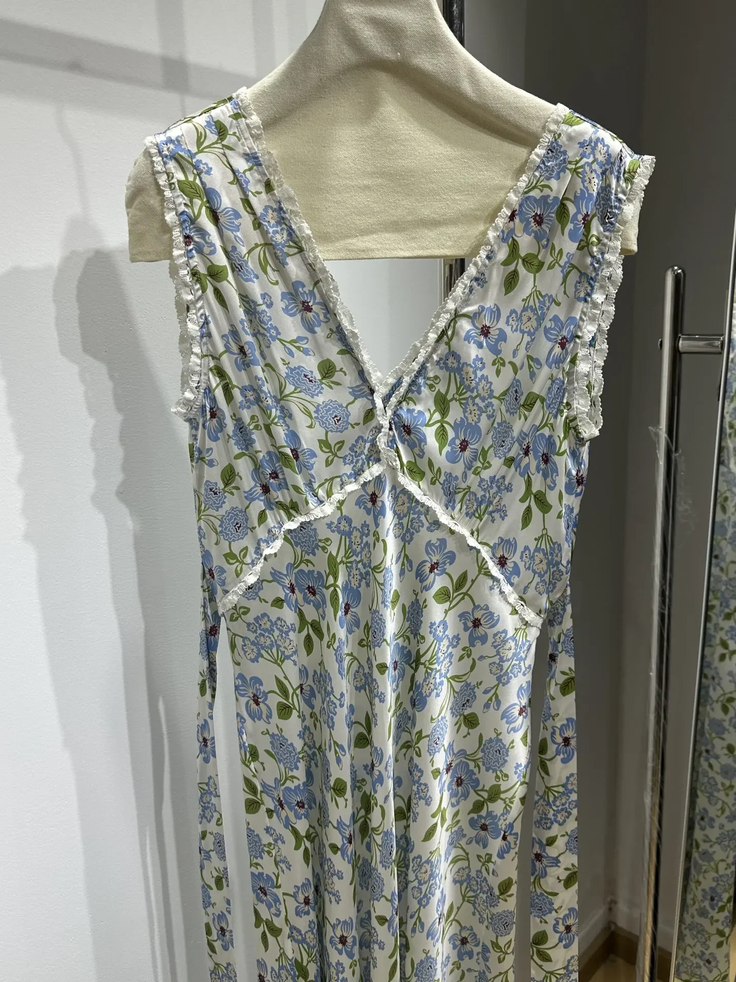 Robe mi-longue sans manches à volants et imprimé floral vert Deep V 2025 Nouveau desig...