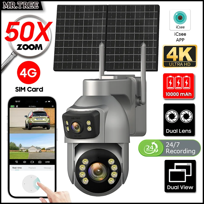 Caméra de Surveillance à énergie solaire 4G SIM, Zoom 4K 50X, double objectif, ...