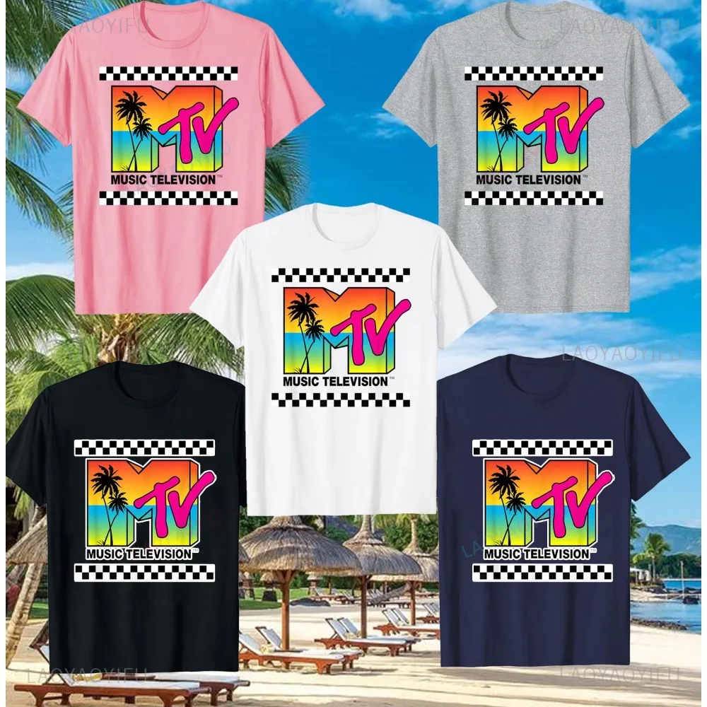 MTV Beach Island Logo rétro graphique 100% coton T-shirt M-T-V coucher de soleil palmier impr...