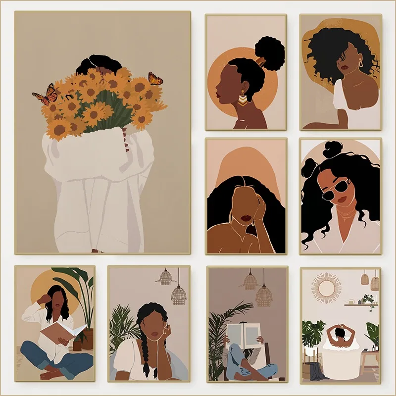 Affiche de Portrait de femme noire abstraite, peinture sur toile de fille de mode afro-améric...