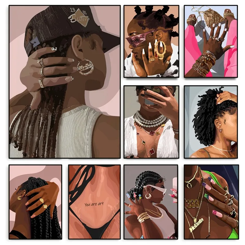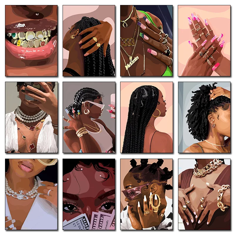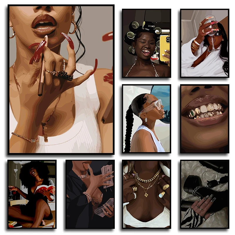 Hip Hop noir fille or bijoux affiche imprimer belle femme cheveux toile peinture Afro mur Art pour C...