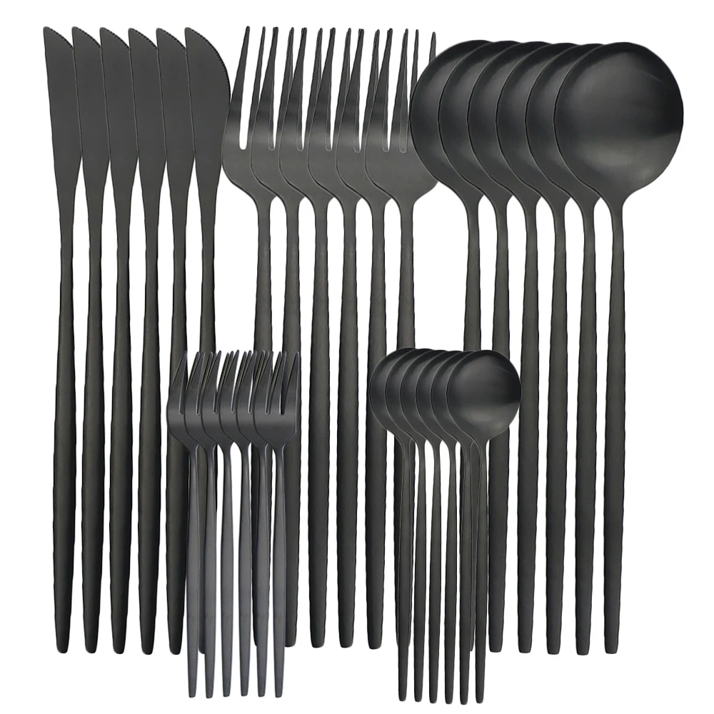 30 pièces noir argent ensemble de couverts couteau fourchett...